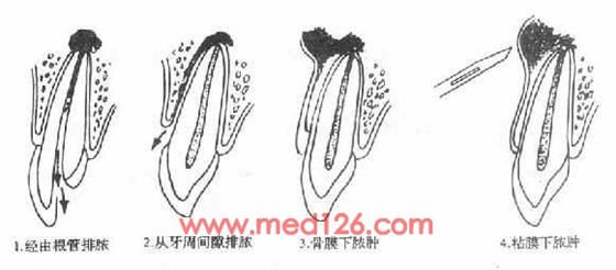 積聚在根尖部的膿液常沿阻力小的部位排出,排膿途徑有: