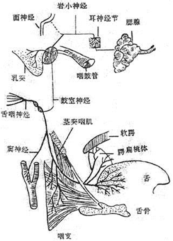 分清耳顳神經(jīng)、下牙槽神經(jīng)、頰神經(jīng)及肌支,沿舌神經(jīng)向上追蹤,找出其上段,探查面神經(jīng)發(fā)出的鼓索加入舌神經(jīng)的情況。
