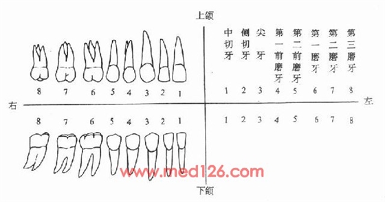 以“+”符號將上下牙弓分為四區(qū)。符號的水平線用以區(qū)分上下;垂直線用以區(qū)分左右?;蛞詀 B C D分別代表各區(qū),A代表右上區(qū),B代表左上區(qū),C代表右下區(qū),D代表左下區(qū)。恒牙用阿拉伯?dāng)?shù)字1、2、3、4、5、6、7、8代表,乳牙用羅馬數(shù)字Ⅰ、Ⅱ、Ⅲ、Ⅳ、Ⅴ代表,乳牙名稱及代號見(圖1-4),恒牙名稱及代號見(圖1-5),例如: