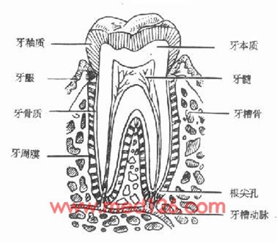 牙本質(zhì)(Dentin):是構(gòu)成牙齒的主體部分,由基質(zhì)和牙本質(zhì)小管組成,牙本質(zhì)小管中有來自造牙本質(zhì)細(xì)胞的細(xì)胞突,藉此以進(jìn)行營養(yǎng)代射,牙本質(zhì)鈣化程度和硬度比牙釉質(zhì)稍低,色淡黃,不透明。無機(jī)鹽類約70%,主要為羥磷灰石,含磷酸鈣等,有機(jī)物約占30%,主要是膠原蛋白。醫(yī)學(xué)全.在線網(wǎng).站.提供