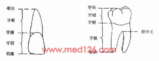 從外部觀察,牙體由冠、牙根及牙頸三部分組成(圖1-6)。